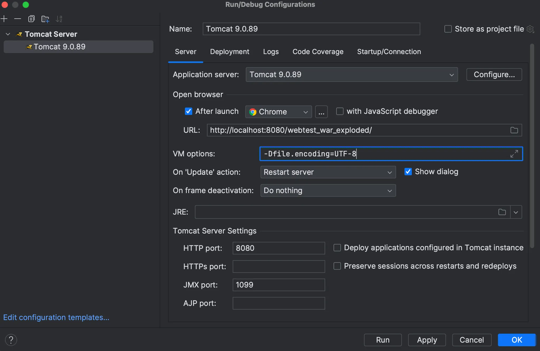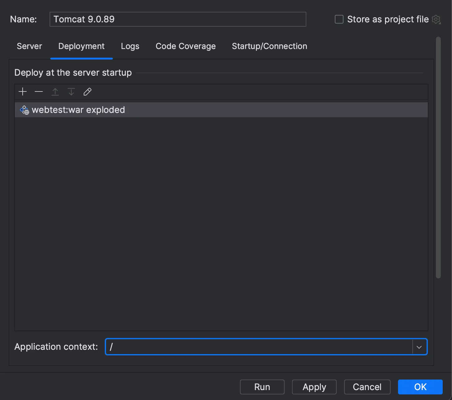 Deployment 메뉴에서 Application context를 “/”으로 설정 ⇒ 이렇게 하면 Tomcat Server 실행 시 http://localhost:8080/ 이 주소로 접속됨
