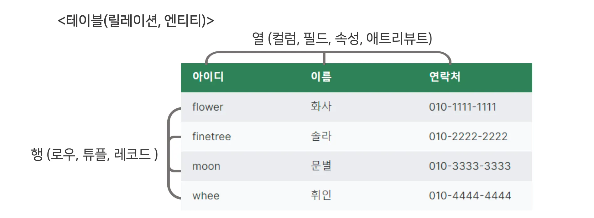 데이터베이스를 테이블(릴레이션, 엔티티)이라는 최소 단위로 구성되어 있다.