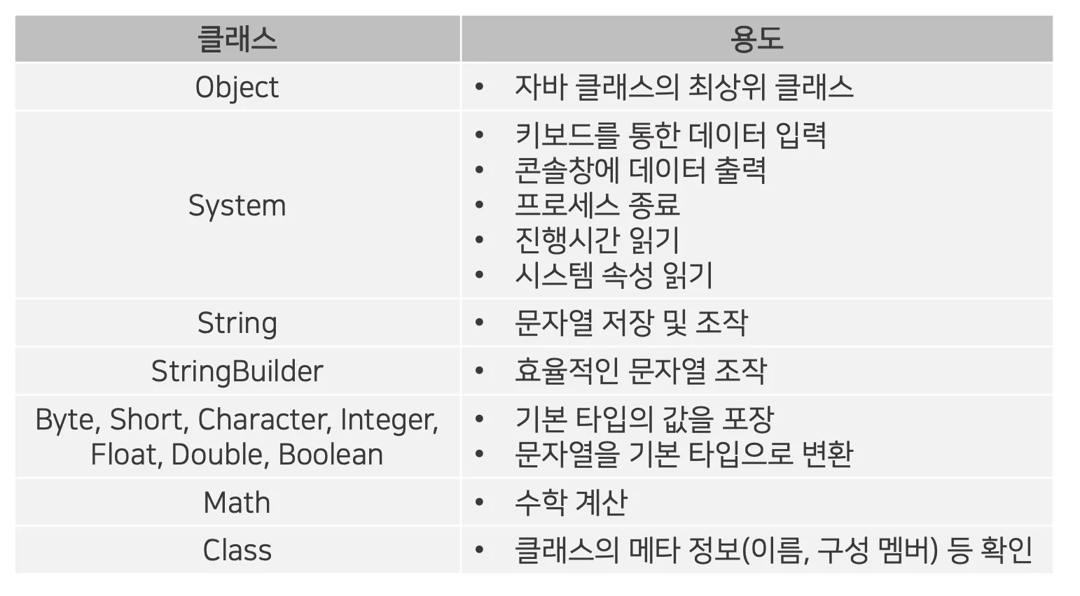 String, System, Integer, Double, Exception, RuntimeException 등의 클래스는 모두 java.lang 패키지에 있고, Scanner는 java.util 패키지에 있다.