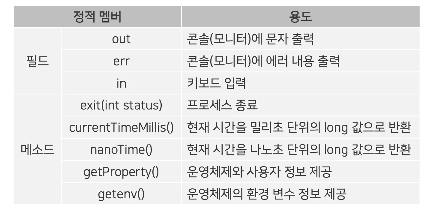 System 클래스의 정적 필드와 메소드를 이용하면 프로그램 종료, 키보드 입력, 콘솔 출력, 현재 시간 읽기