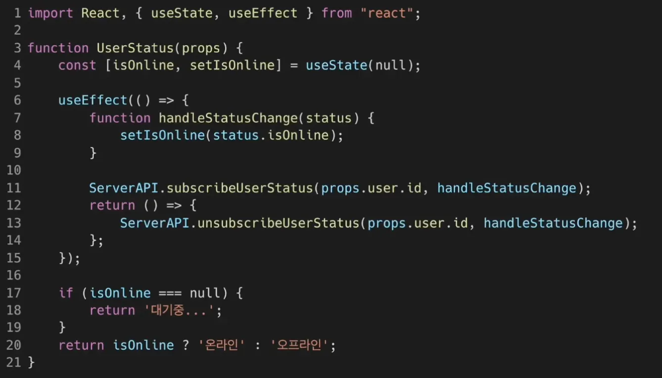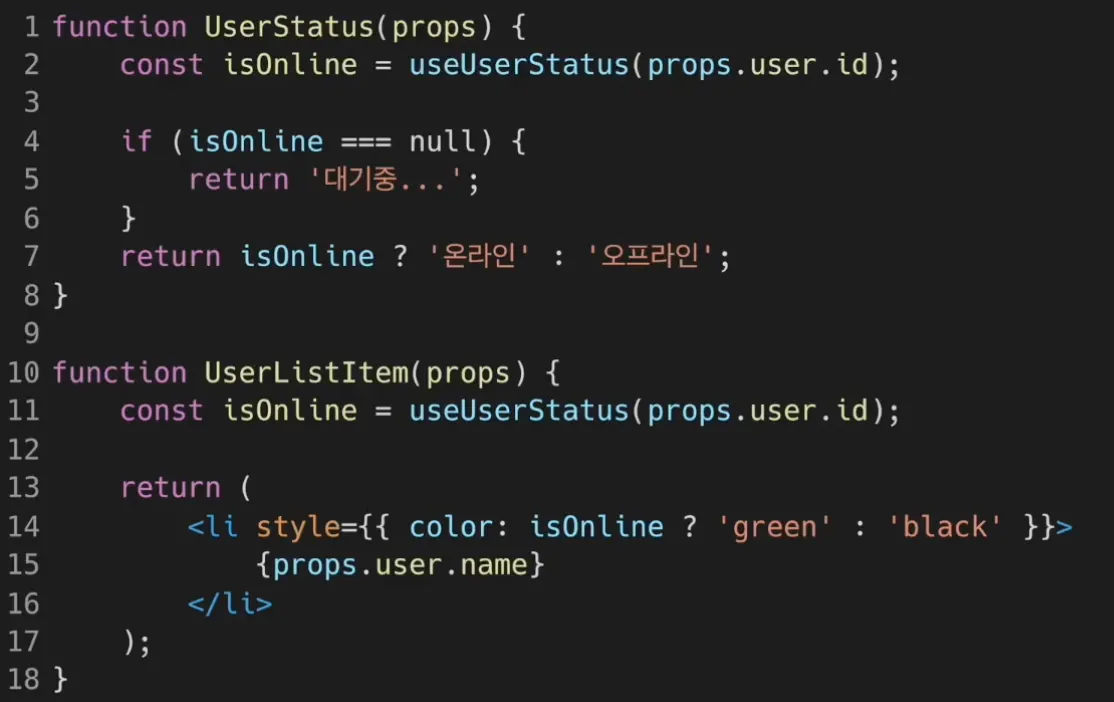 이름이 use로 시작하고 내부에서 다른 Hook을 호출하는 하나의 자바스크립트 함수