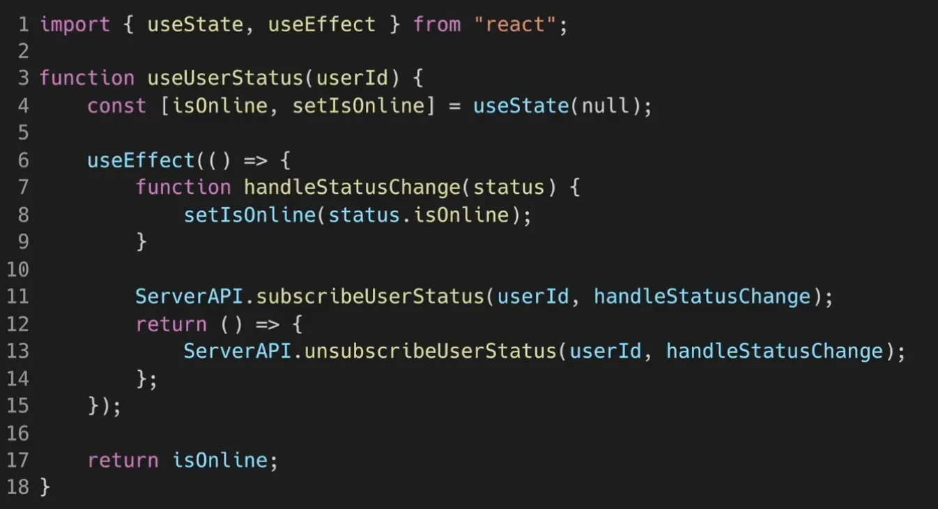 여러 개의 컴포넌트에서 하나의 Custom Hook을 사용할 때 컴포넌트 내부에 있는 모든 state와 effects는 전부 분리되어 있다.