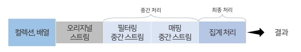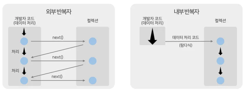 for문, iterator는 컬렉션 요소를 컬렉션 바깥쪽으로 반복해서 가져와 처리하지만 스트림은 요소 처리 방법을 컬렉션 내부로 주입시켜서 요소를 반복 처리하는 내부 반복자이다.