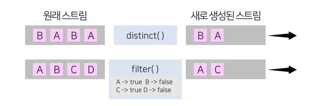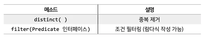 필터링은 요소를 걸러내는 중간 처리 기능으로, distinct()와 filter() 메소드가 필터링에 쓰인다.