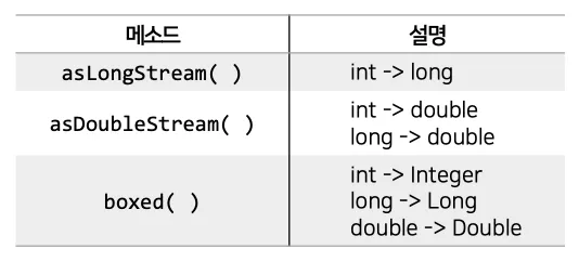 asDoubleStream( ), asLongStream( ) 메소드는 기본 타입 간의 변환에 사용되며,