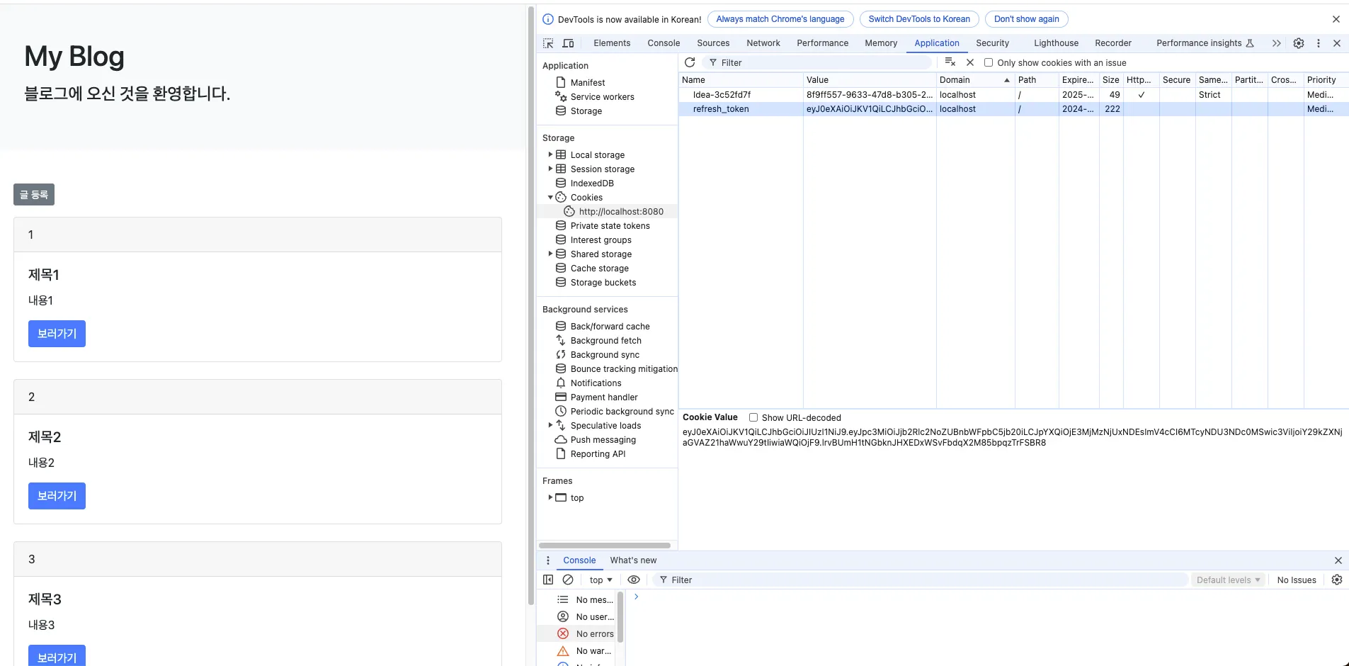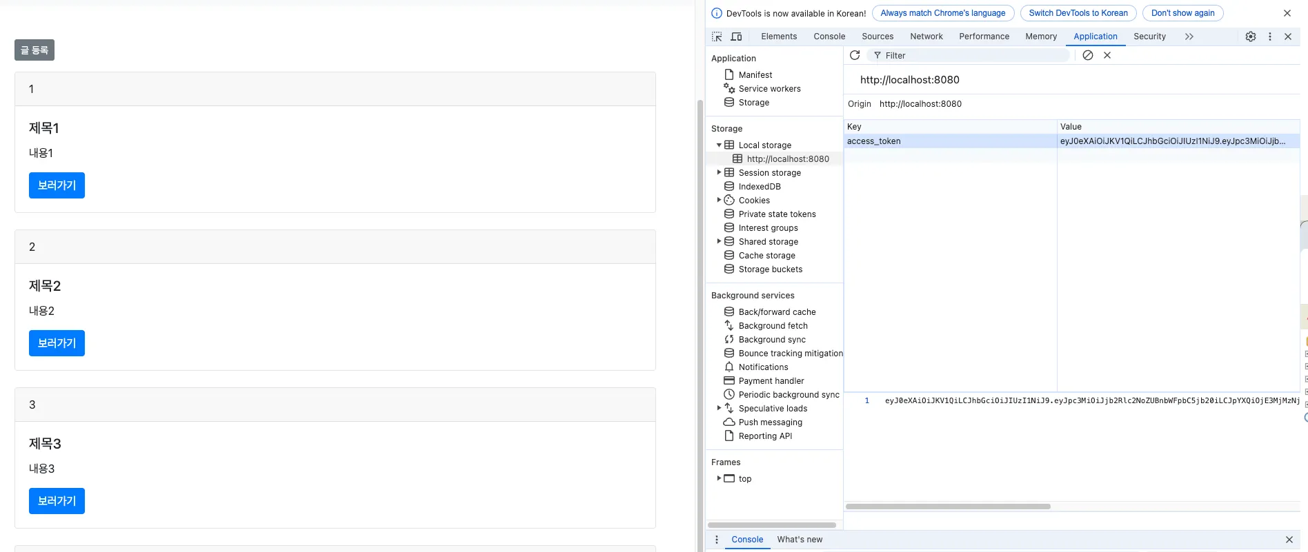 로그인이 완료되면 /articles로 리다이렉트되며, 쿼리 파라미터에 token, 액세스 토큰을 요청 헤더로 전달한다. 그 뒤에 브라우저 메뉴에서 [도구 더보기] → [개발자 도구] 를 클릭해 개발자 도구를 열어 [Application]의 [Local Storage]를 클릭하면 스프링 부트 애플리케이션으로 부터 전달 받은 액세스 토큰을 저장한다는 것을 확인할 수 있다. 리프레시 토큰도 확인할 수 있다.