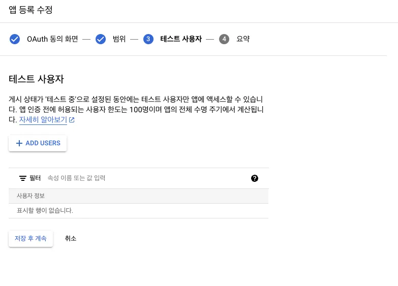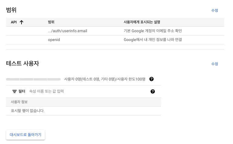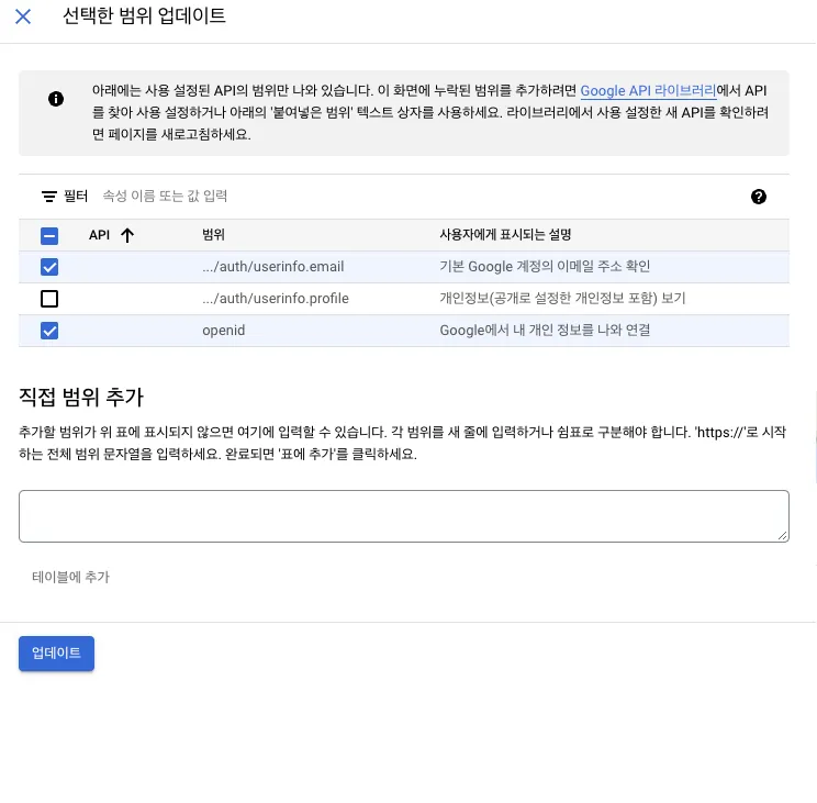 범위 설정 화면에서는 [범위 추가 또는 삭제] 버튼을 누르고 openid와 이메일 주소를 추가하고 [업데이트]를 눌러 마무리한다. 작업을 마치면 [저장 후 계속] 버튼을 누른다