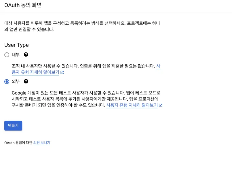사용자 인증 정보를 만들려면 OAuth 동의 화면을 먼저 구성해야 한다. [동의 화면 구성] 버튼을 누르고 User Type을 외부용으로 선택한 후 [만들기] 버튼을 클릭한다.