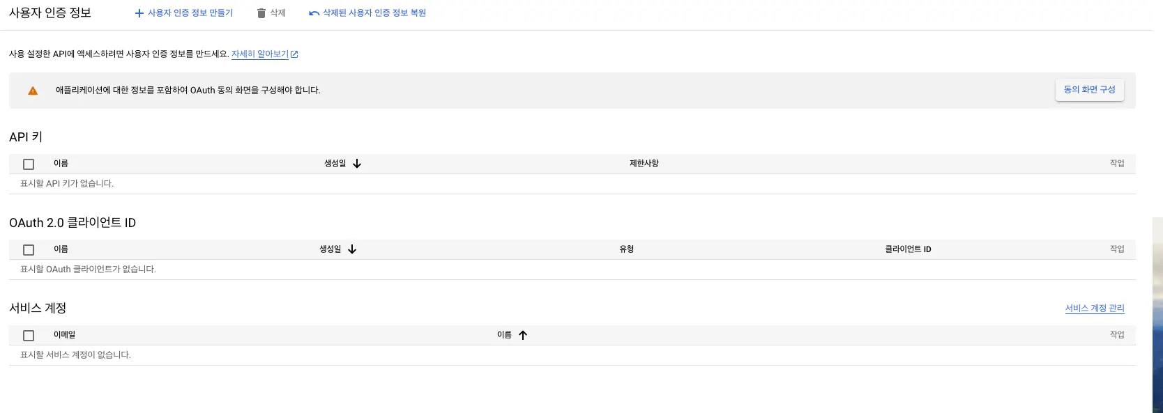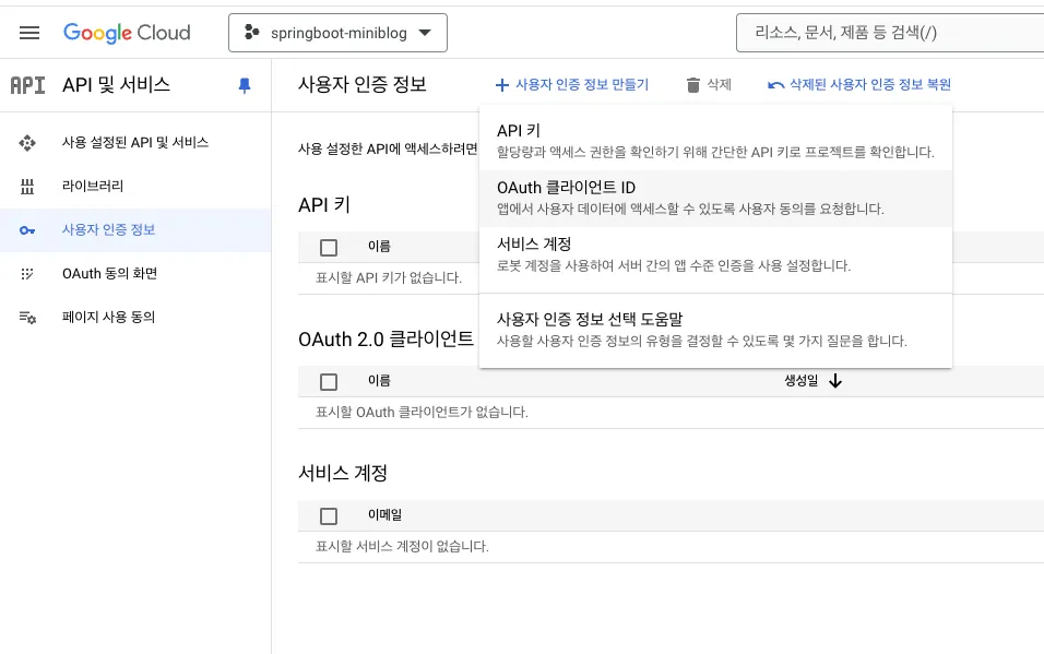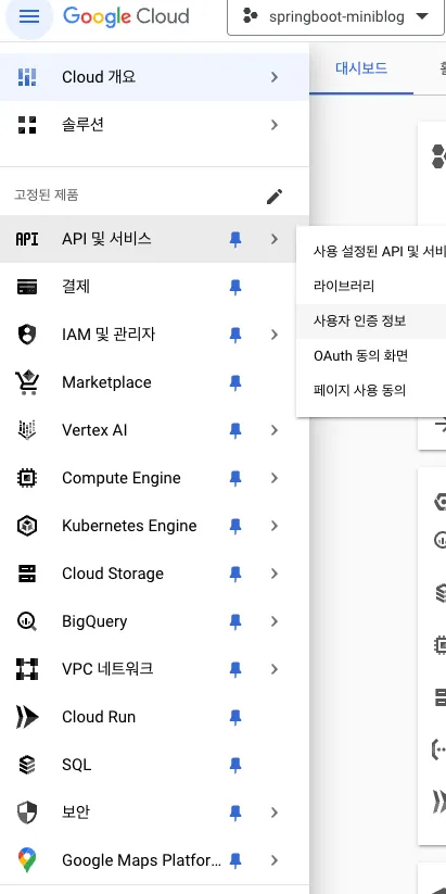 프로젝트 생성 후에 왼쪽 햄버거 메뉴에서 [API 및 서비스 → 사용자 인증 정보] 버튼을 눌러 사용자 인증을 관리하는 페이지로 이동