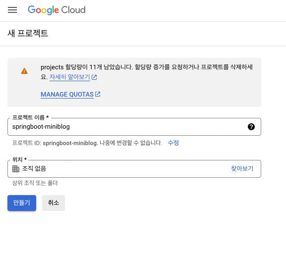 프로젝트 이름 지은 다음에 만들기 버튼 클릭