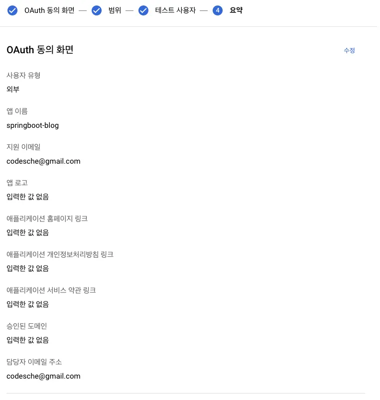 그 뒤에 나오는 클라이언트 ID와 클라이언트 보안 비밀번호는 애플리케이션에서 사용하는 값이므로 따로 메모한다. 생성된 OAuth 인증값은 추후에 리소스 오너의 정보에 접근할 때 사용한다.