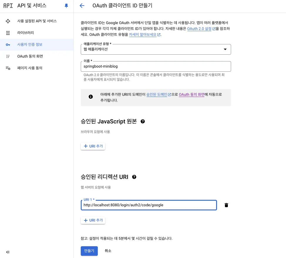 이어서 애플리케이션 유형은 [웹 애플리케이션], 이름은 springboot-miniblog, 승인된 리디렉션 URI에는 http://localhost:8080/login/oauth2/code/google을 입력한 다음에 [만들기]를 클릭한다.