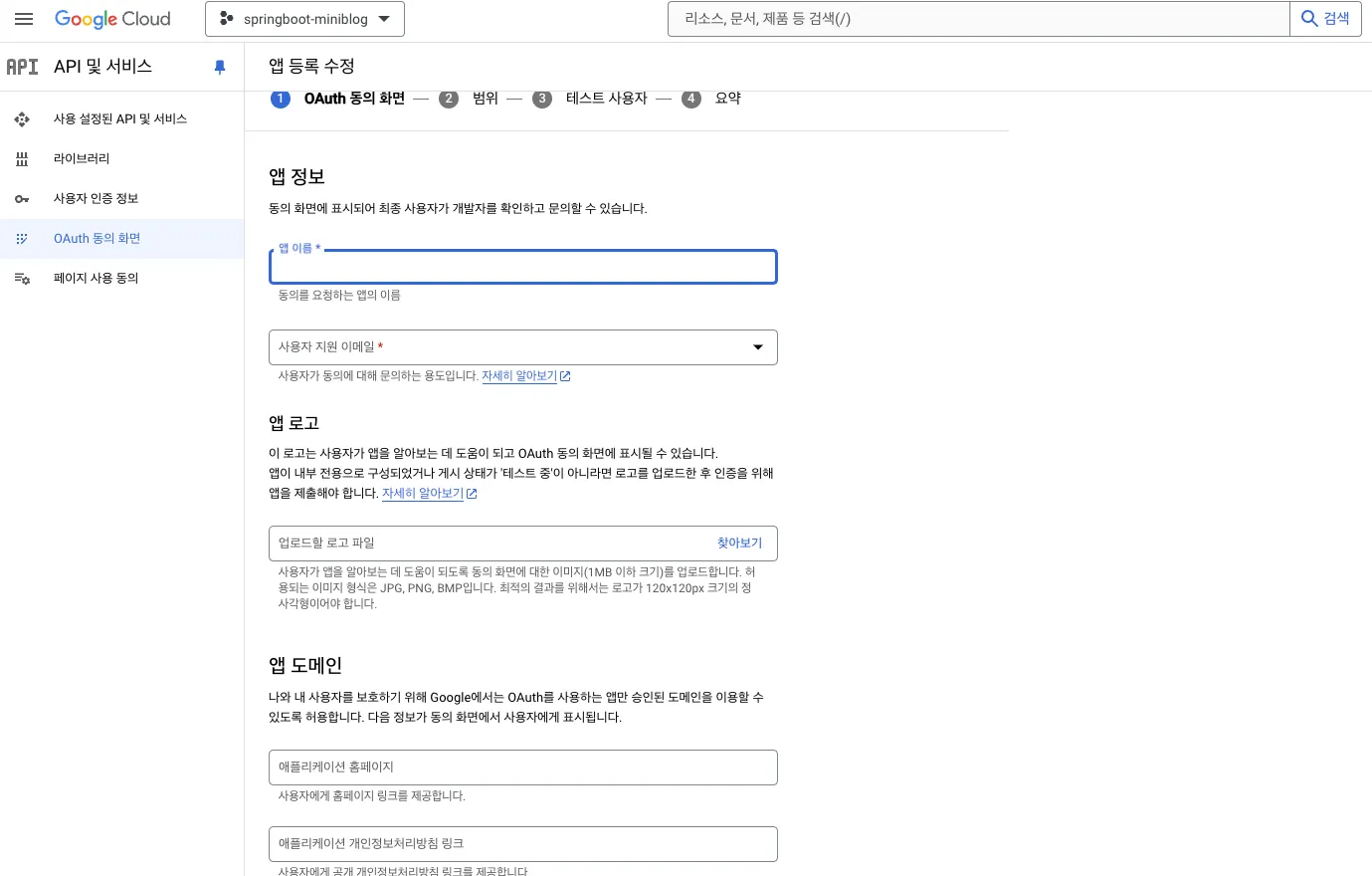 값 입력 화면이 나오는데 앱 이름은 자유롭게 입력하고 이메일, 개발자 연락처를 꼭 입력한다. 입력 후 [저장 후 계속] 버튼을 눌러 다음으로 진행한다.